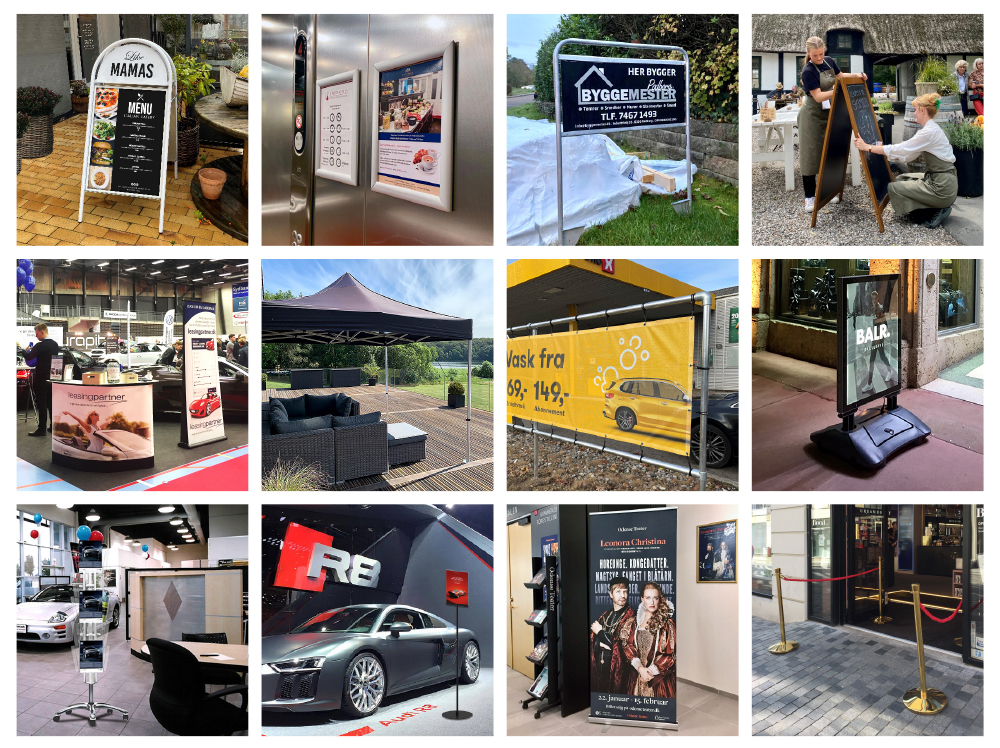 Uanset om du har brug for gadeskilte, plakatrammer, udhængsskilte, LED skilte, bannerophæng, messestande eller noget helt andet, står vi klar med løsninger, der sikrer effektiv synlighed for dine budskaber.